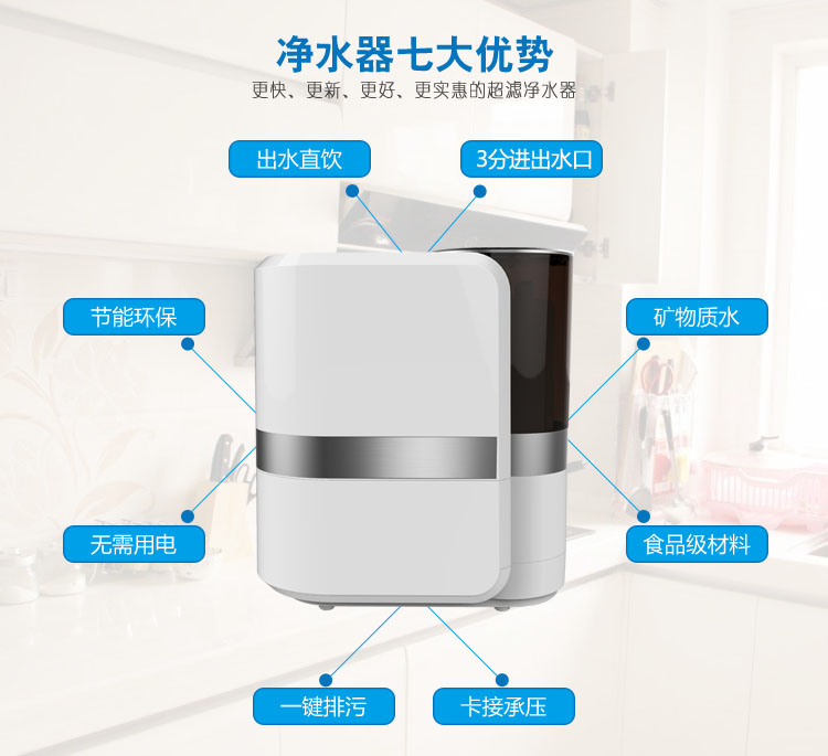 產品介紹:優端卡接7級超濾凈水器采用7級層層過濾,保留水中有益礦物質!凈水器超濾膜技術采用進口食品級PAN材質制作而成,表面具有優良親水性,不容易沾污,0.01微米高精度過濾,保證水的潔凈、衛生、安全。過濾后出水為弱堿性礦物質水,保留對人體有益的微量元素和礦物質。
