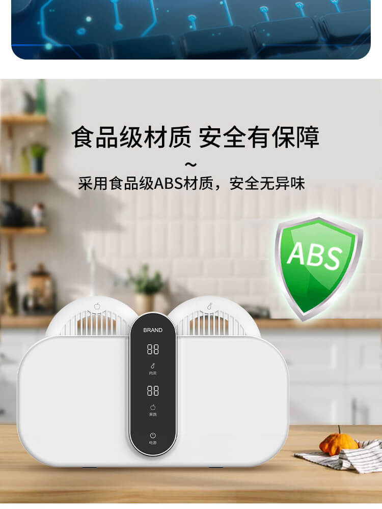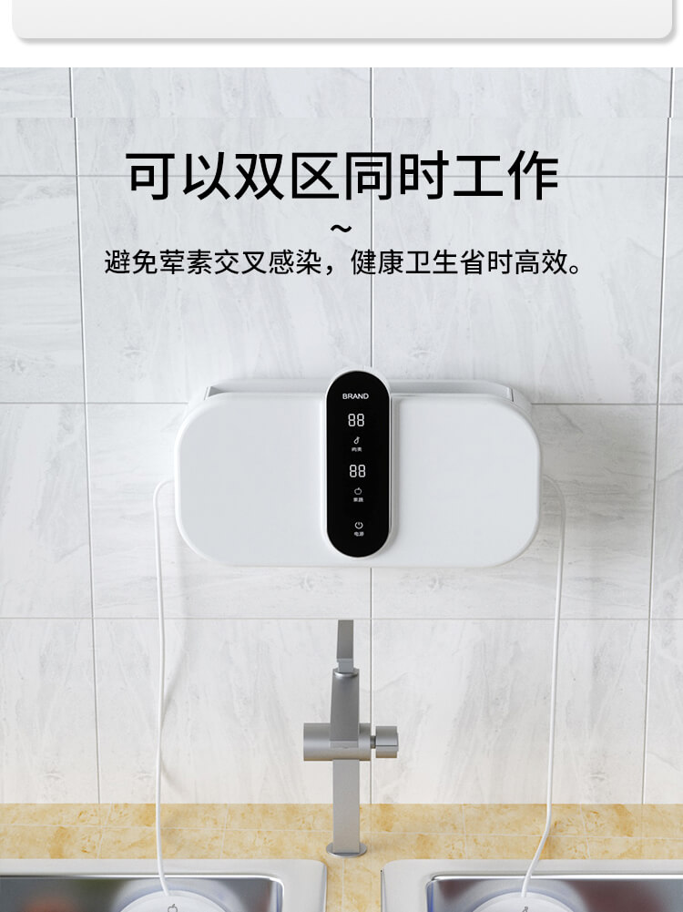 臺(tái)面壁掛雙用途,免打孔背膠設(shè)計(jì),輕松掛在廚房任意角落,臺(tái)面放置小巧不占地方,STY23D雙倉(cāng)設(shè)計(jì),葷素雙凈同時(shí)啟動(dòng),專用果蔬、肉類點(diǎn)解發(fā)生器,避免交叉感染,雙凈同時(shí)啟動(dòng),省時(shí)更高效.