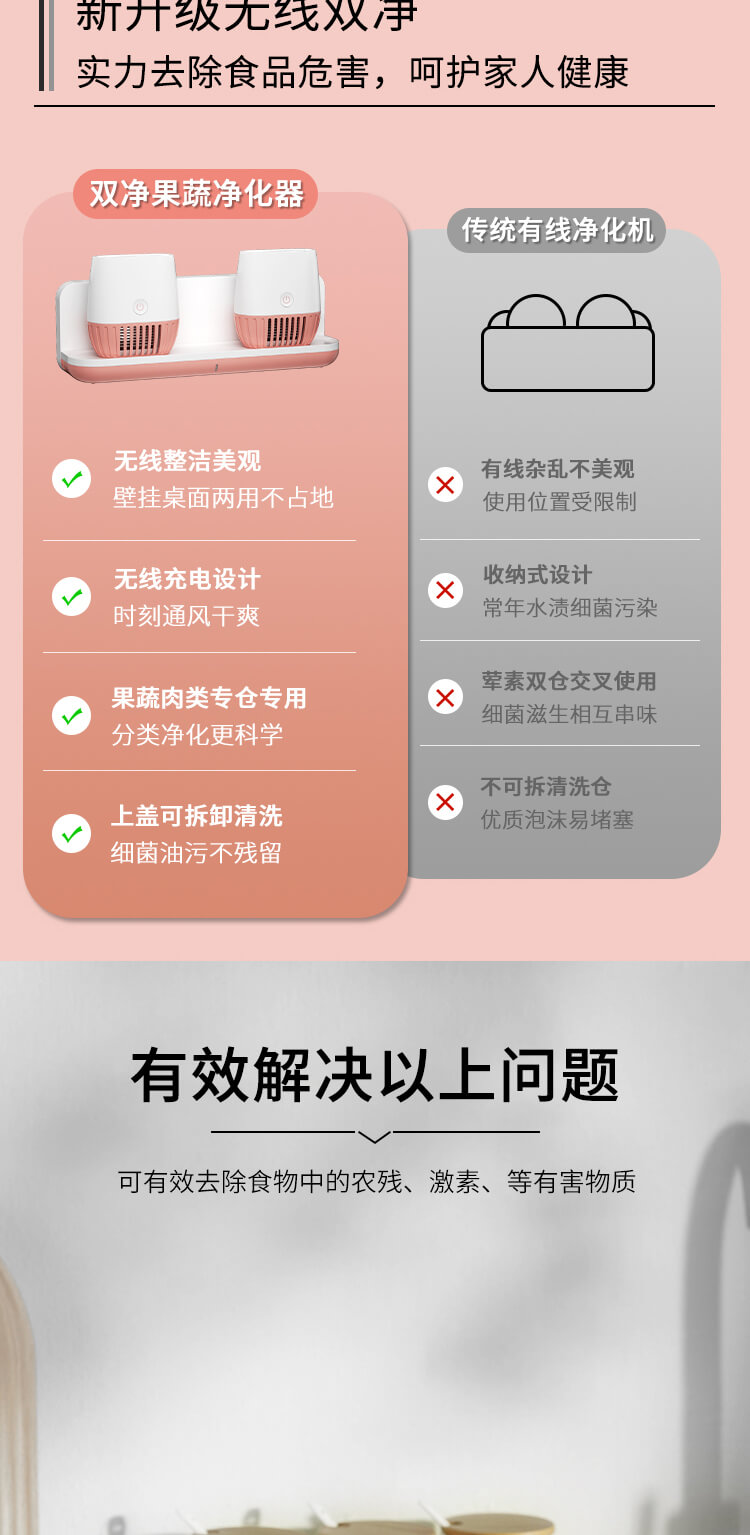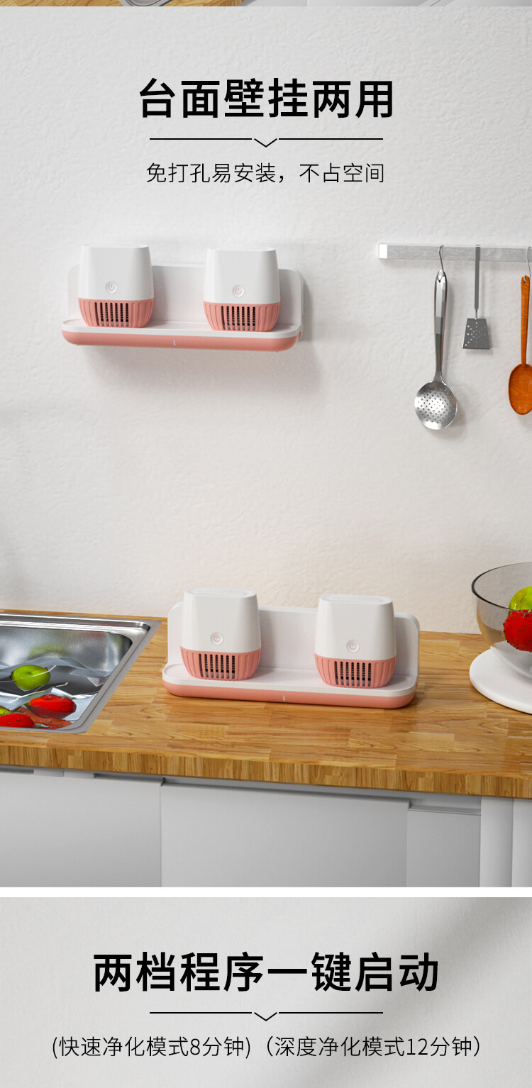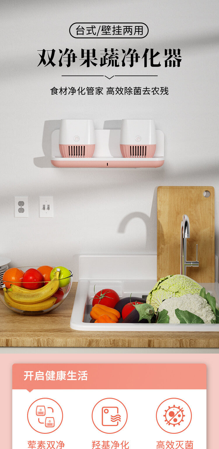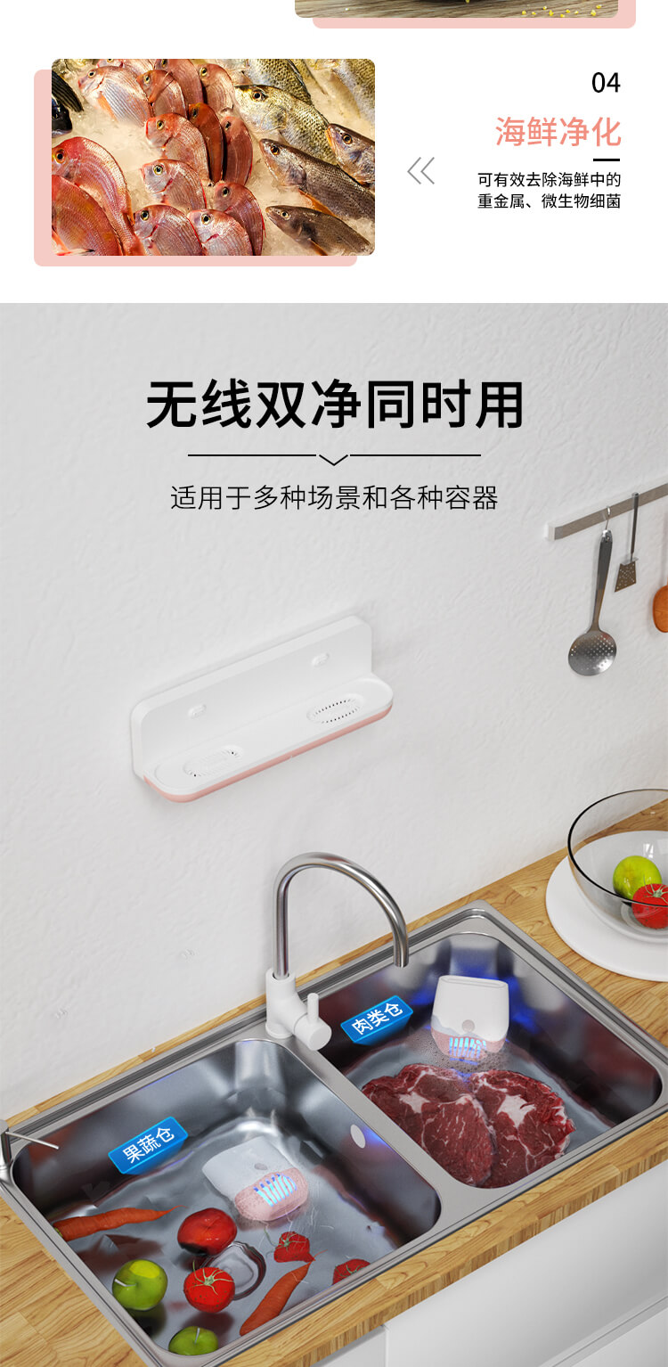 臺面壁掛雙用途,免打孔背膠設計,輕松掛在廚房任意角落,臺面放置小巧不占地方。無線雙倉設計,葷素雙凈同時啟動,專用果蔬、肉類點解發生器,避免交叉感染,雙凈同時啟動,省時更高效。