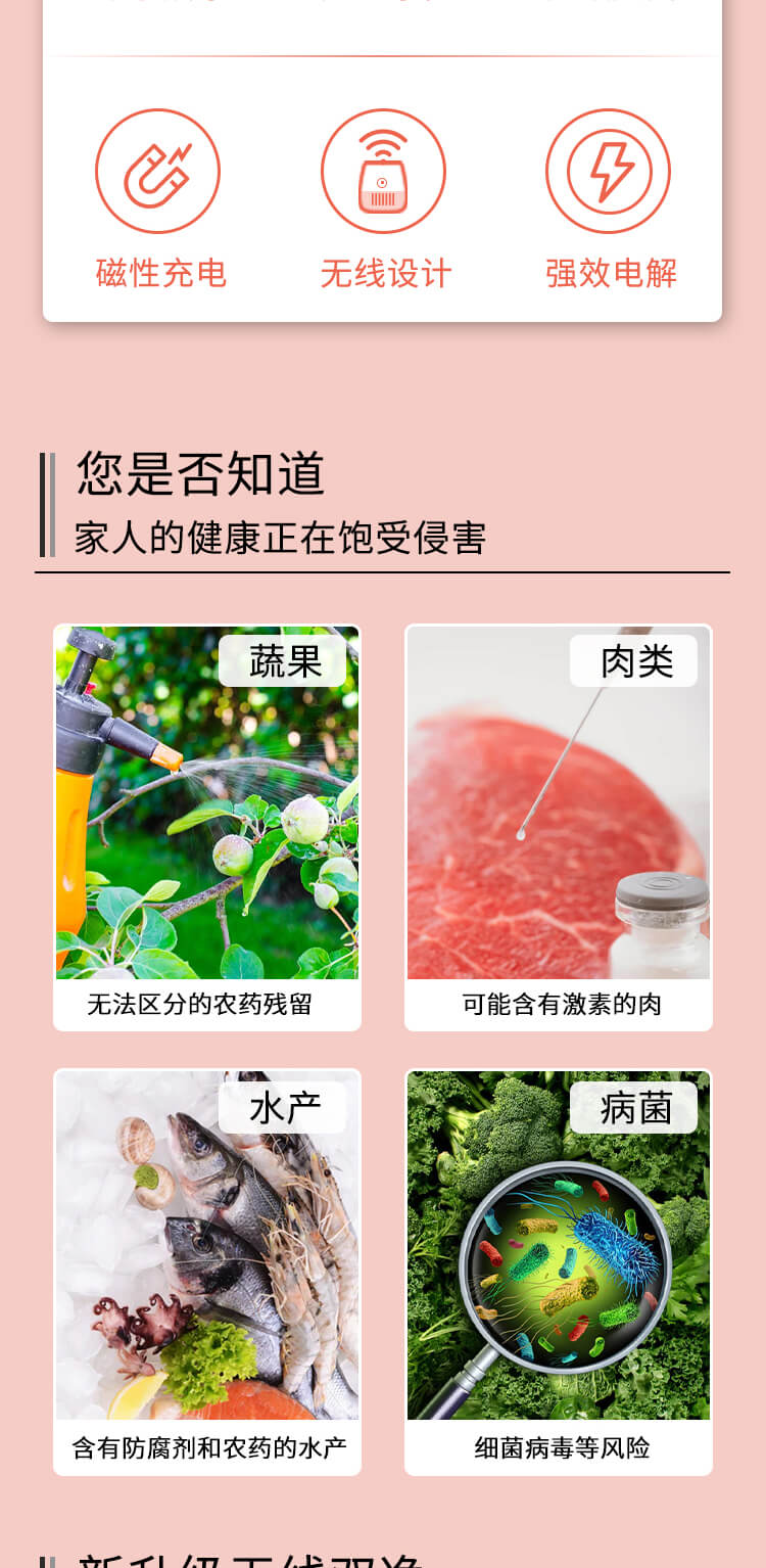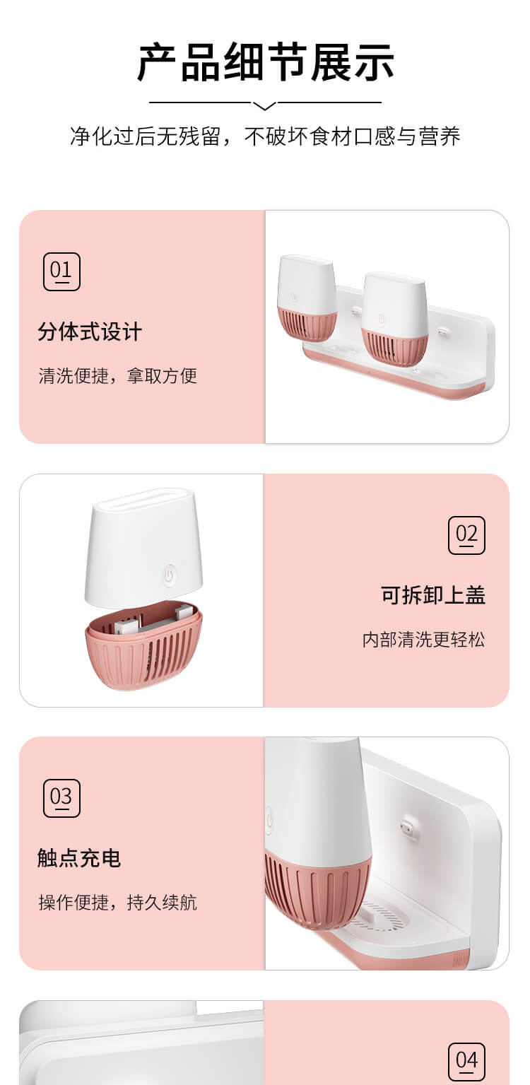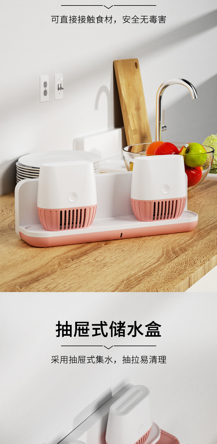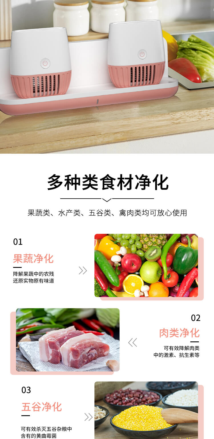 臺面壁掛雙用途,免打孔背膠設計,輕松掛在廚房任意角落,臺面放置小巧不占地方。無線雙倉設計,葷素雙凈同時啟動,專用果蔬、肉類點解發生器,避免交叉感染,雙凈同時啟動,省時更高效。